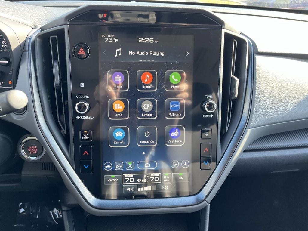 - Radio: Subaru 11.6" Multimedia Plus System -inc: AM/FM stereo, HD Radio, multi-touch gesture high resolution display screen, voice activated controls, Bluetooth® audio streaming and hands-free phone connectivity, Bluetooth® hands-free SMS text messaging connectivity, iPod control capability, smartphone integration: wired and wireless Android Auto w/full screen view and wireless Apple CarPlay w/full screen view, USB and Over The Air (OTA) audio system update, steering wheel audio system and Bluetooth® control switches, 6 speakers (2 dash panel tweeter, 2 front door and 2 rear door), illuminated 3.5mm auxiliary input jack, illuminated front USB A and C input/charge ports, connected services operation indicator, SOS emergency assistance: red SOS button and enhanced roadside assistance: blue i-button