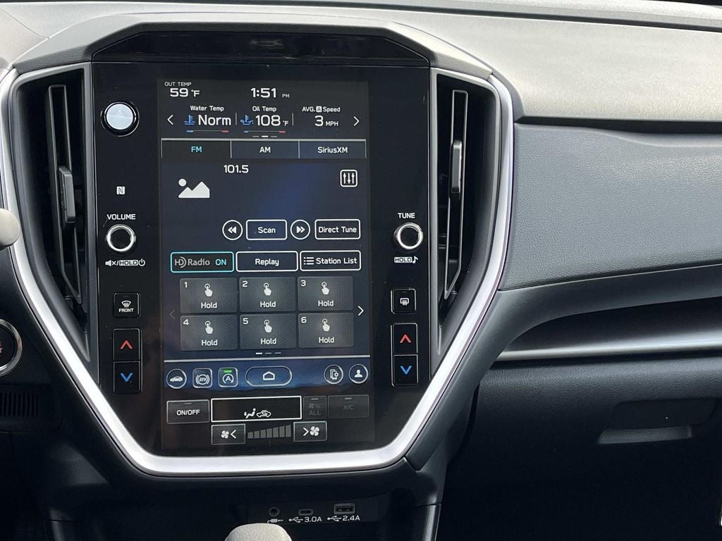 - Radio: Subaru 11.6" Multimedia Plus System -inc: valet mode, AM/FM stereo, HD Radio, multi-touch gesture high resolution display screen, voice activated controls, Bluetooth® audio streaming and hands-free phone connectivity, Bluetooth® hands-free SMS text messaging connectivity, iPod control capability, smartphone integration: wired and wireless Android Auto w/full screen view, wireless Apple CarPlay w/full screen view and wireless connection, USB and Over The Air (OTA) audio system update, audio system and Bluetooth® steering wheel control switches, 6 speakers (2 dash panel tweeter, 2 front door, 2 rear door), illuminated 3.5mm auxiliary input jack, illuminated USB A and C input charge ports, roof mounted satellite and connected services, roof mounted black antenna, connected services operation indicator, SOS emergency assistance (red button) and ehanced roadside assistance (blue i-button)